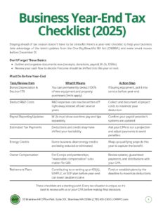 Whether you’re a business owner or an individual taxpayer, the clock is ticking to capture new tax deductions. Download the 2025 Year-End Tax Checklists today.